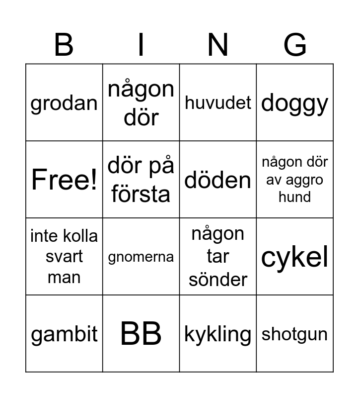 This bingo card has 16 words: BB, cykel, huvudet, grodan, inte kolla svart man, någon dör, någon tar sönder, kykling, Free!, dör på första, gambit, doggy, gnomerna, någon dör av aggro hund, döden and shotgun.