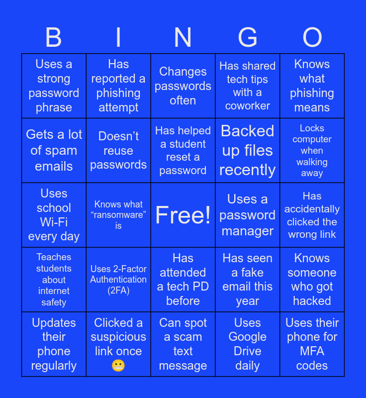This bingo card has a free space and 24 words: Uses 2-Factor Authentication (2FA), Clicked a suspicious link once 😬, Has helped a student reset a password, Updates their phone regularly, Knows what phishing means, Uses a strong password phrase, Gets a lot of spam emails, Has reported a phishing attempt, Uses a password manager, Has attended a tech PD before, Backed up files recently, Uses school Wi-Fi every day, Has seen a fake email this year, Knows someone who got hacked, Doesn’t reuse passwords, Uses Google Drive daily, Has accidentally clicked the wrong link, Changes passwords often, Locks computer when walking away, Knows what “ransomware” is, Uses their phone for MFA codes, Teaches students about internet safety, Has shared tech tips with a coworker and Can spot a scam text message.