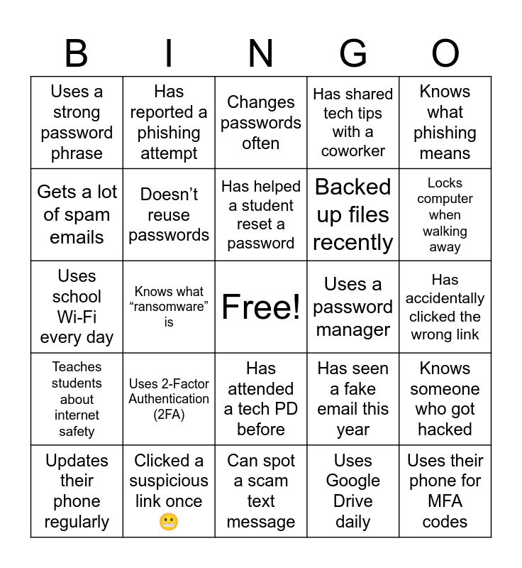 This bingo card has a free space and 24 words: Uses 2-Factor Authentication (2FA), Clicked a suspicious link once 😬, Has helped a student reset a password, Updates their phone regularly, Knows what phishing means, Uses a strong password phrase, Gets a lot of spam emails, Has reported a phishing attempt, Uses a password manager, Has attended a tech PD before, Backed up files recently, Uses school Wi-Fi every day, Has seen a fake email this year, Knows someone who got hacked, Doesn’t reuse passwords, Uses Google Drive daily, Has accidentally clicked the wrong link, Changes passwords often, Locks computer when walking away, Knows what “ransomware” is, Uses their phone for MFA codes, Teaches students about internet safety, Has shared tech tips with a coworker and Can spot a scam text message.