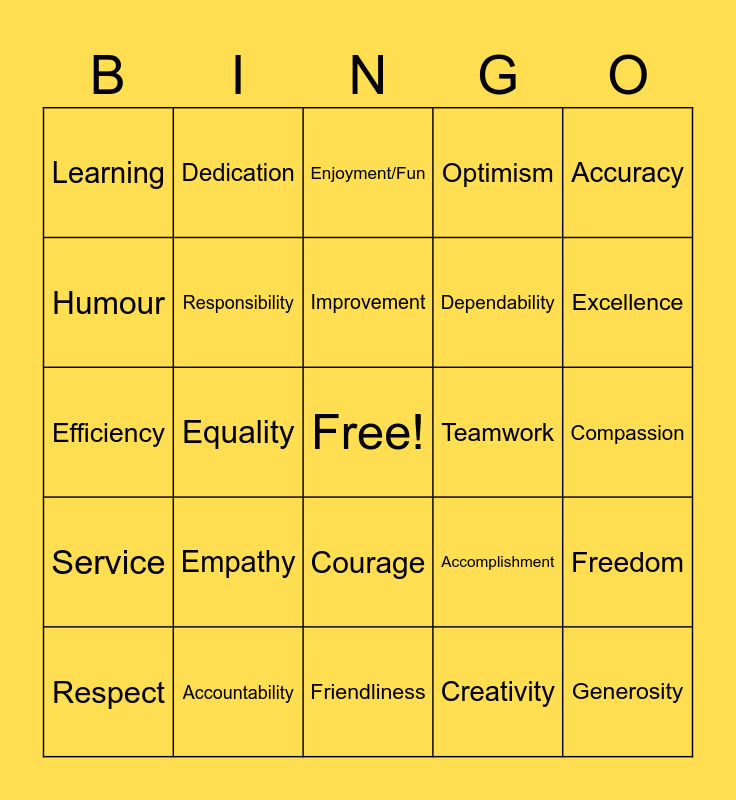 This bingo card has a free space and 33 words: Ambitious, Individuality, Equality, Integrity, Service, Responsibility, Accuracy, Respect, Dedication, Diversity, Improvement, Enjoyment/Fun, Loyalty, Honesty, Teamwork, Excellence, Accountability, Efficiency, Empathy, Accomplishment, Courage, Wisdom, Learning, Compassion, Friendliness, Generosity, Optimism, Dependability, Humour, Freedom, Pride, Creativity and Curiosity.