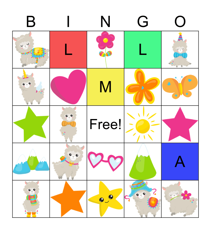 This bingo card has 24 images, a free space and 5 words: L, L, A, M and A.