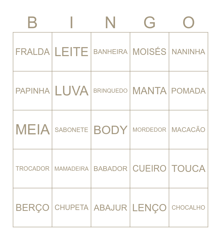 This bingo card has a free space and 24 words: MAMADEIRA, CHUPETA, BRINQUEDO, BERÇO, NANINHA, FRALDA, PAPINHA, LEITE, MORDEDOR, BABADOR, MANTA, MEIA, CUEIRO, TOUCA, LUVA, LENÇO, MACACÃO, BANHEIRA, POMADA, SABONETE, CHOCALHO, TROCADOR, MOISÉS and ABAJUR.