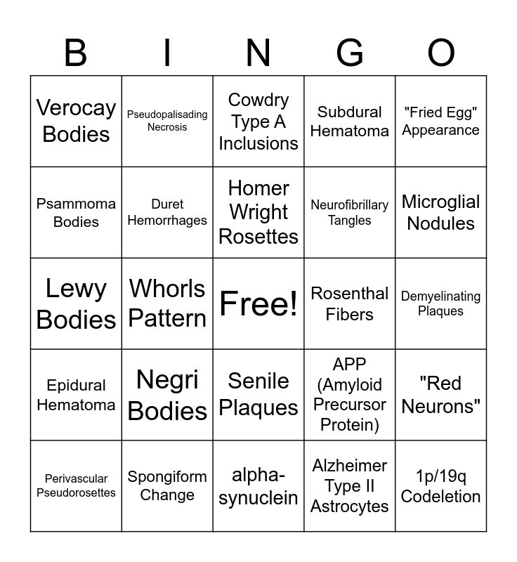 This bingo card has a free space and 24 words: Negri Bodies, Spongiform Change, Homer Wright Rosettes, Perivascular Pseudorosettes, "Fried Egg" Appearance, Verocay Bodies, Psammoma Bodies, Pseudopalisading Necrosis, Rosenthal Fibers, Senile Plaques, Neurofibrillary Tangles, Lewy Bodies, APP (Amyloid Precursor Protein), "Red Neurons", Duret Hemorrhages, Alzheimer Type II Astrocytes, Demyelinating Plaques, Cowdry Type A Inclusions, Microglial Nodules, Whorls Pattern, 1p/19q Codeletion, Epidural Hematoma, Subdural Hematoma and alpha-synuclein.