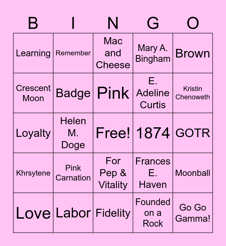 This bingo card has a free space and 24 words: Pink Carnation, Labor, Pink, Love, Brown, Learning, Crescent Moon, Remember, 1874, For Pep & Vitality, E. Adeline Curtis, Loyalty, Frances E. Haven, Moonball, Badge, Founded on a Rock, GOTR, Mac and Cheese, Kristin Chenoweth, Helen M. Doge, Go Go Gamma!, Khrsytene, Mary A. Bingham and Fidelity.