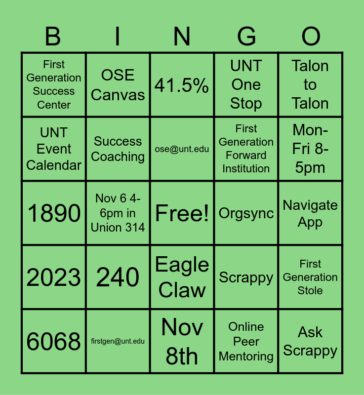 This bingo card has a free space and 34 words: OSE Honor Cord, Online Peer Mentoring, Jumpstart, Advisory Board, 2023, Success Coaching, Talon to Talon, 6068, OSE Canvas, OSE Podcast, ose@unt.edu, 41.5%, Union suite 376, Instagram & LinkTree, Orgsync, Mon-Fri 8-5pm, firstgen@unt.edu, 1890, 240, Scrappy, Eagle Claw, 1922, First Generation Success Center, Navigate App, Nov 8th, Ask Scrappy, UNT One Stop, 456 Million, First Generation Forward Institution, UNT Event Calendar, Willis Library, Nov 6 4-6pm in Union 314, First Generation Stole and UNT Dragons.