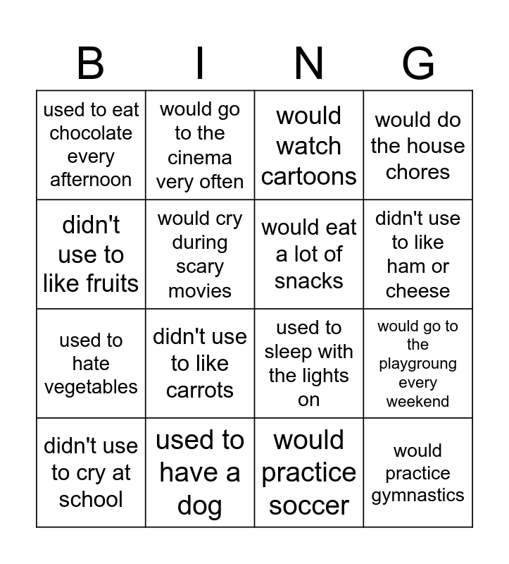 This bingo card has 16 words: used to have a dog, would go to the playgroung every weekend, would watch cartoons, used to eat chocolate every afternoon, used to hate vegetables, would go to the cinema very often, used to sleep with the lights on, would practice soccer, didn't use to like fruits, would cry during scary movies, didn't use to cry at school, would do the house chores, didn't use to like carrots, didn't use to like ham or cheese, would eat a lot of snacks and would practice gymnastics.