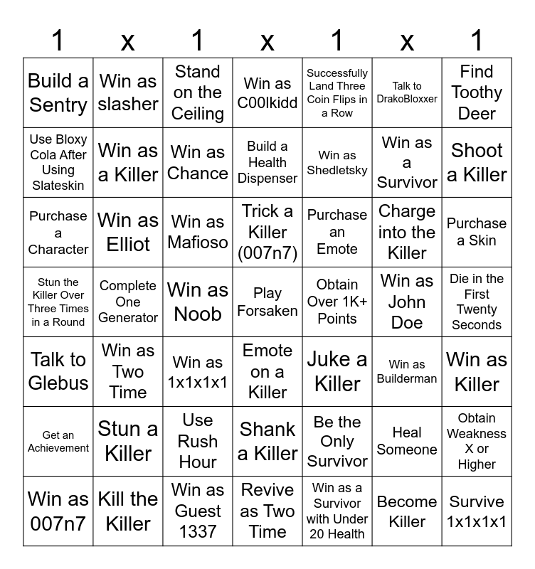 This bingo card has a free space and 48 words: Be the Only Survivor, Win as a Survivor, Revive as Two Time, Complete One Generator, Win as Mafioso, Die in the First Twenty Seconds, Win as slasher, Kill the Killer, Talk to DrakoBloxxer, Emote on a Killer, Find Toothy Deer, Win as C00lkidd, Charge into the Killer, Purchase an Emote, Get an Achievement, Win as John Doe, Use Bloxy Cola After Using Slateskin, Shoot a Killer, Heal Someone, Successfully Land Three Coin Flips in a Row, Win as Shedletsky, Win as Noob, Build a Sentry, Win as a Killer, Obtain Weakness X or Higher, Win as Chance, Purchase a Skin, Win as 007n7, Trick a Killer (007n7), Win as Elliot, Become Killer, Obtain Over 1K+ Points, Win as Killer, Stun a Killer, Stun the Killer Over Three Times in a Round, Juke a Killer, Win as Builderman, Purchase a Character, Win as 1x1x1x1, Use Rush Hour, Talk to Glebus, Survive 1x1x1x1, Stand on the Ceiling, Win as Guest 1337, Build a Health Dispenser, Shank a Killer, Win as Two Time and Win as a Survivor with Under 20 Health.