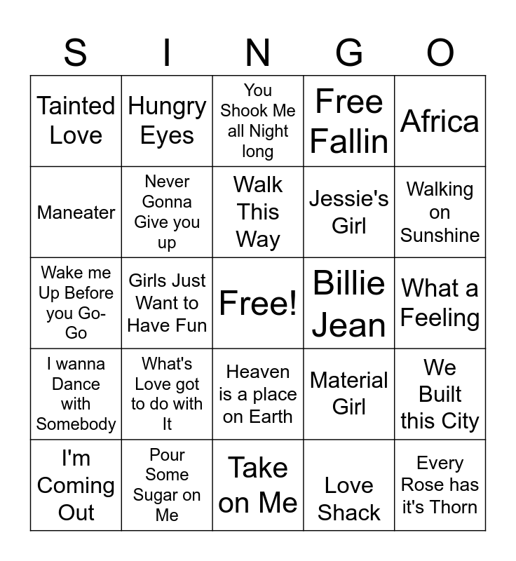 This bingo card has a free space and 32 words: Love Shack, Total Eclipse of the Heart, Girls Just Want to Have Fun, Sweet Dreams, I wanna Dance with Somebody, Never Gonna Give you up, Africa, We Built this City, Hungry Eyes, Living on a Prayer, Walk This Way, You Shook Me all Night long, Under Pressure, We Got the Beat, Billie Jean, Uptown Girl, I'm Coming Out, Wake me Up Before you Go-Go, Heaven is a place on Earth, What's Love got to do with It, Material Girl, Just the Two of Us, What a Feeling, Pour Some Sugar on Me, Every Rose has it's Thorn, Free Fallin, Jessie's Girl, Maneater, Tainted Love, Take on Me, Video Killed the Radio Star and Walking on Sunshine.