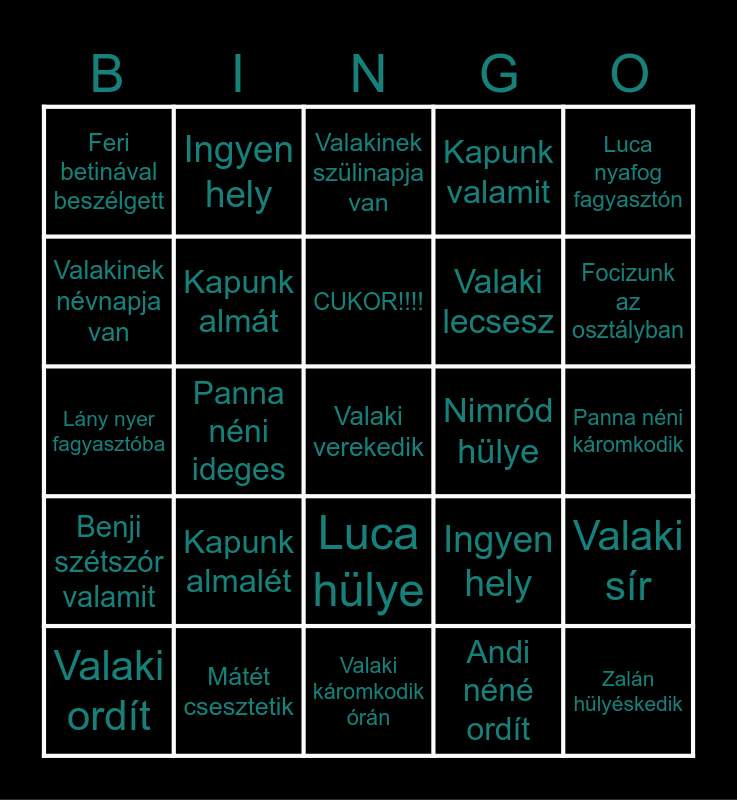 This bingo card has a free space and 28 words: Valaki sír, Veszekedés, Valaki lecsesz, Andi néné ordít, Valakinek névnapja van, Valakinek szülinapja van, Ingyen hely, Benji szétszór valamit, Nimród hülye, Valaki ordít, Lány nyer fagyasztóba, Kapunk valamit, Mátét csesztetik, Valaki káromkodik órán, Focizunk az osztályban, Kapunk tejjet, Kapunk almalét, Kapunk almát, CUKOR!!!!, Luca hülye, Feri betinával beszélgett, Regina ír a naplójába, Zalán hülyéskedik, Panna néni ideges, Panna néni káromkodik, Ingyen hely, Luca nyafog fagyasztón and 5-öst kapsz.