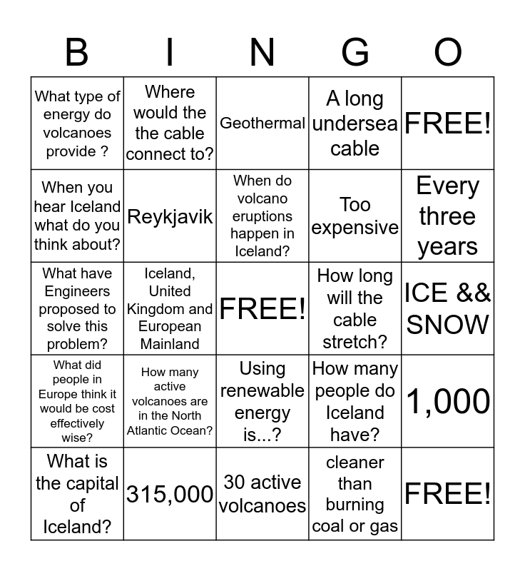 This bingo card has a free space and 24 words: How many active volcanoes are in the North Atlantic Ocean?, 315,000, When do volcano eruptions happen in Iceland?, What is the capital of Iceland?, FREE!, What type of energy do volcanoes provide ?, When you hear Iceland what do you think about?, Where would the the cable connect to?, How long will the cable stretch?, Using renewable energy is...?, Too expensive, What have Engineers proposed to solve this problem?, How many people do Iceland have?, 1,000, Reykjavik, cleaner than burning coal or gas, ICE && SNOW, Geothermal, Every three years, Iceland, United Kingdom and European Mainland, FREE!, What did people in Europe think it would be cost effectively wise?, A long undersea cable and 30 active volcanoes.