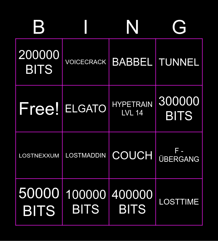 This bingo card has 16 words: 100000 BITS, F - ÜBERGANG, BABBEL, 200000 BITS, LOSTNEXXUM, VOICECRACK, COUCH, 400000 BITS, Free!, ELGATO, 50000 BITS, TUNNEL, LOSTMADDIN, 300000 BITS, HYPETRAIN LVL 14 and LOSTTIME.