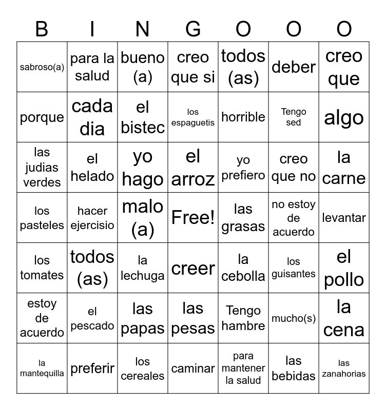 This bingo card has a free space and 48 words: Tengo hambre, Tengo sed, caminar, hacer ejercisio, yo hago, levantar, para la salud, preferir, deber, creer, creo que, creo que si, creo que no, yo prefiero, estoy de acuerdo, no estoy de acuerdo, porque, algo, mucho(s), todos (as), horrible, malo (a), sabroso(a), cada dia, la cena, el bistec, la carne, la mantequilla, el arroz, el helado, las bebidas, las grasas, el pollo, el pescado, los pasteles, la cebolla, los guisantes, las judias verdes, la lechuga, las papas, los tomates, las zanahorias, bueno (a), los cereales, los espaguetis, las pesas, todos (as) and para mantener la salud.