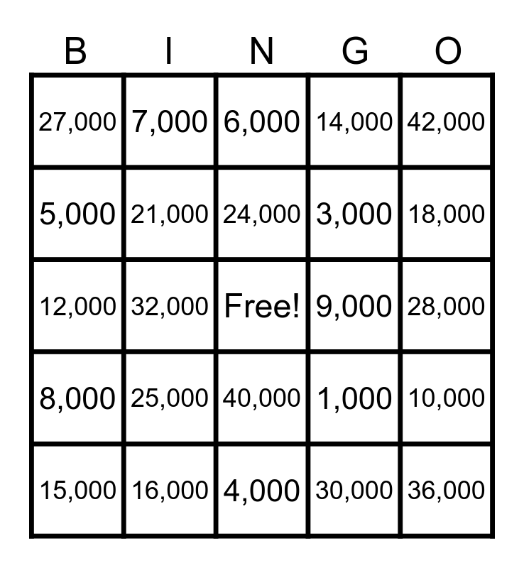This bingo card has a free space and 27 words: 1,000, 2,000, 3,000, 4,000, 5,000, 6,000, 7,000, 8,000, 9,000, 10,000, 12,000, 14,000, 15,000, 16,000, 18,000, 20,000, 21,000, 24,000, 25,000, 27,000, 28,000, 30,000, 32,000, 36,000, 40,000, 42,000 and 48,000.