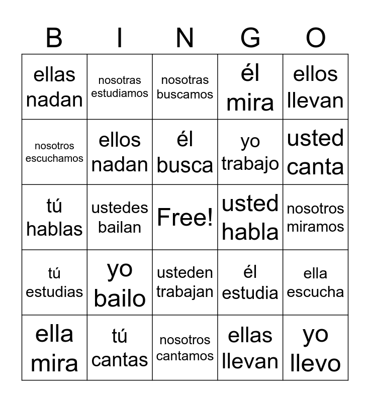 This bingo card has a free space and 24 words: yo bailo, tú cantas, él busca, ella mira, ellos llevan, ellas nadan, nosotros escuchamos, nosotras estudiamos, usted habla, usteden trabajan, yo trabajo, tú hablas, él estudia, ella escucha, ellos nadan, ellas llevan, nosotros miramos, nosotras buscamos, usted canta, ustedes bailan, yo llevo, tú estudias, él mira and nosotros cantamos.