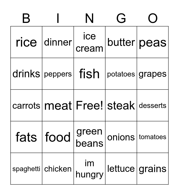This bingo card has a free space and 24 words: food, chicken, fish, spaghetti, peas, rice, drinks, dinner, steak, green beans, potatoes, carrots, onions, tomatoes, peppers, lettuce, desserts, ice cream, grapes, meat, grains, fats, butter and im hungry.