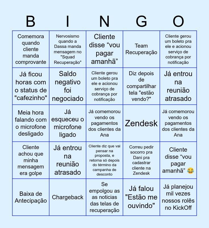 This bingo card has 42 words: Já bocejou vendo a Gabi bocejar?, Cliente gerou um boleto pra ele e acionou serviço de cobrança por notificação, Já esqueceu o microfone ligado, Já entrou na reunião atrasado, Já falou "Estão me ouvindo", Cliente disse “vou pagar amanhã” 😂, Já comemorou vendo os pagamentos dos clientes da Ana, Já falou "Estão me ouvindo?", Cliente disse “vou pagar amanhã”, Cliente diz que vai pensar na proposta, e retorna só depois do término da campanha de desconto, Já comemorou vendo os pagamentos dos clientes da Ana, Já entrou na reunião atrasado, Já esqueceu o microfone ligado, Cliente gerou um boleto pra ele e acionou serviço de cobrança por notificação, Já bocejou vendo a Gabi bocejar?, Correu pedir socorro pra Dani pra cadastrar cliente na Zendesk, Ficou ansioso para contar um babado do final de semana na daily de segunda, Meia hora falando com o microfone desligado, Nervoso quando recebe áudio do cliente, Nervosismo quando a Dassa manda mensagem no "Squad Recuperação", Já ficou horas com o status de "cafezinho", Ficou nervoso quando escreveu no lugar errado na planilha, Já planejou mil vezes nossos rolês no KickOff, Comemora quando cliente manda comprovante, Já ficou pensativo que música mandar quando bate meta de comprovante, Só enrola quando está na sede, Diz depois de compartilhar tela "estão vendo?", Cliente pediu para renegociar, Cliente paga e ainda agradece, Já levou um susto com a câmera roxa da Gabi, Já ouviu a Gabi brigando com a Chloe, Cliente achou que minha mensagem era golpe, Saldo negativo foi negociado, Se empolgou as as noticias das telas de recuperação, Boleto, Baixa de Antecipação, Chargeback, Zendesk, Taxas, Debito Apropriado, Team Recuperação and Cobrança Master.