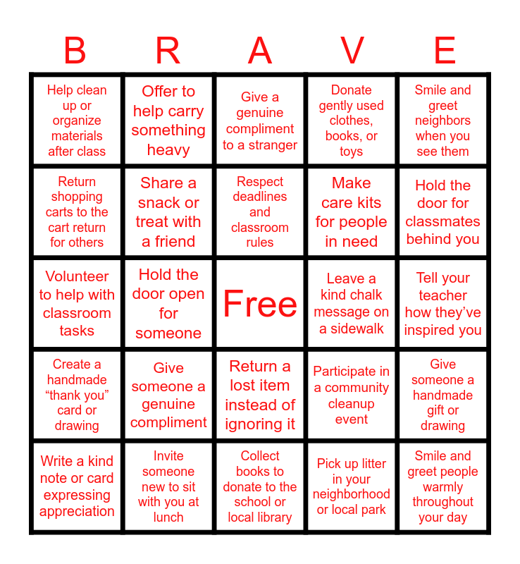 This bingo card has a free space and 43 words: Say “thank you” to your teacher at the end of class, Hold the door open for someone, Write three things you’re grateful for each morning, Pick up litter in your neighborhood or local park, Call or visit an older relative regularly, Write a kind note or card expressing appreciation, Share a snack or treat with a friend, Unplug from screens for an hour to rest your mind, Donate gently used clothes, books, or toys, Offer to help carry groceries or do small chores, Help clean up or organize materials after class, Give someone a genuine compliment, Participate in a community cleanup event, Give someone a handmade gift or drawing, Listen attentively and participate respectfully, Write a thank-you note for a friend or classmate, Celebrate your small wins with a smile or happy dance, Leave a kind chalk message on a sidewalk, Offer to walk their pet or run an errand, Volunteer to help with classroom tasks, Offer to help carry something heavy, Spend 15 minutes doing something you truly enjoy, Support a local small business, Smile and greet neighbors when you see them, Share positive feedback about a lesson or activity, Invite someone new to sit with you at lunch, Return a lost item instead of ignoring it, Volunteer at a food drive or donation center, Smile and greet people warmly throughout your day, Create a handmade “thank you” card or drawing, Send an encouraging text or message, Respect deadlines and classroom rules, Recycle bottles, cans, and paper, Tell your teacher how they’ve inspired you, Help a new student understand classroom routines, Let someone go ahead of you in line, Collect books to donate to the school or local library, Make care kits for people in need, Hold the door for classmates behind you, Return shopping carts to the cart return for others, Clean up trash around the school or in a nearby park, Give a genuine compliment to a stranger and Volunteer at a local animal shelter or homeless shelter.