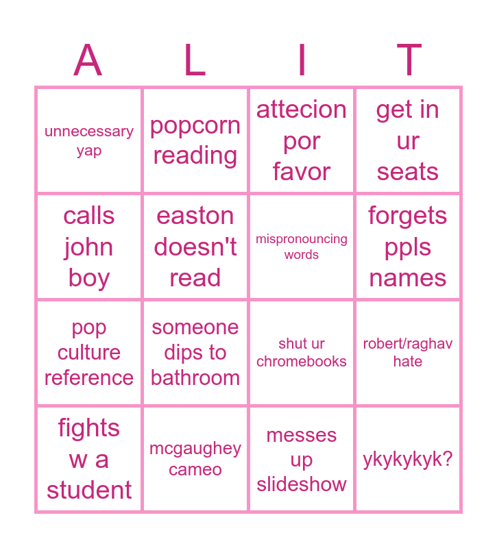 This bingo card has 19 words: shut ur chromebooks, poor literary take, attecion por favor, ykykykyk?, robert/raghav hate, calls john boy, messes up slideshow, unnecessary yap, popcorn reading, pop culture reference, someone dips to bathroom, easton doesn't read, mispronouncing words, mcgaughey cameo, fights w a student, 15mins trying to figure out what to do, get in ur seats, forgets ppls names and "this'll be on ur timed write...".