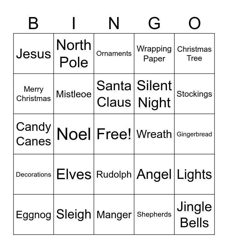 This bingo card has a free space and 24 words: Elves, Sleigh, Santa Claus, Eggnog, Christmas Tree, Jesus, Merry Christmas, North Pole, Wreath, Rudolph, Silent Night, Candy Canes, Angel, Lights, Mistleoe, Shepherds, Gingerbread, Ornaments, Stockings, Noel, Jingle Bells, Decorations, Wrapping Paper and Manger.