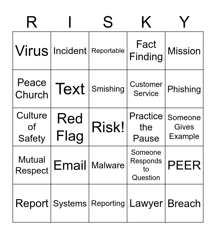This bingo card has a free space and 28 words: PEER, Facts, Customer Service, Lawyer, Peace Church, Reportable, Incident, Mutual Respect, Practice the Pause, Report, Culture of Safety, Fact Finding, Systems, Reporting, Phishing, Password, Email, Text, Smishing, Malware, Virus, Cautious, Breach, Red Flag, Someone Gives Example, Someone Responds to Question, Mission and Values.