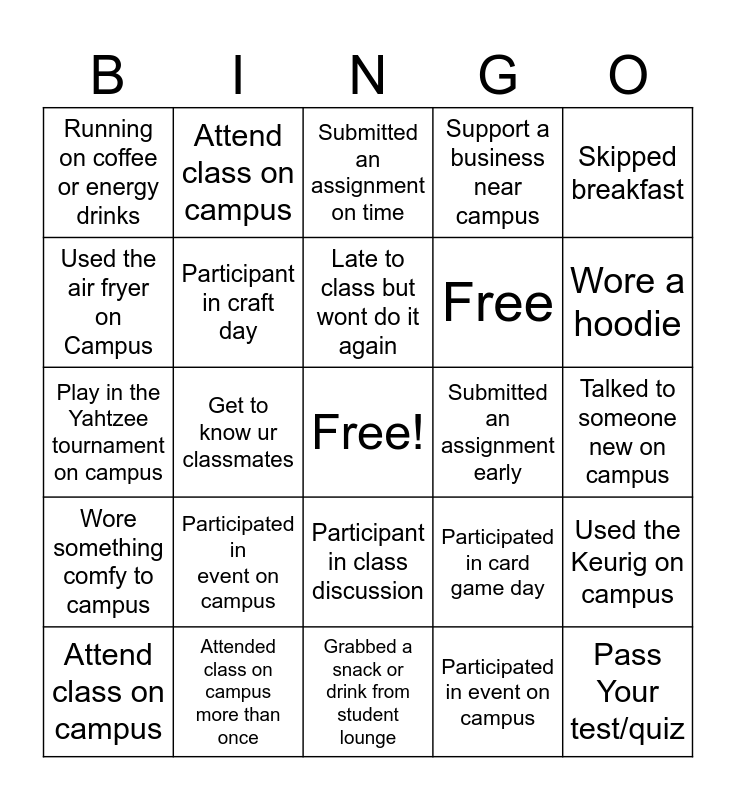 This bingo card has a free space and 24 words: Attend class on campus, Participated in event on campus, Late to class but wont do it again, Participated in event on campus, Skipped breakfast, Running on coffee or energy drinks, Attend class on campus, Submitted an assignment on time, Submitted an assignment early, Talked to someone new on campus, Play in the Yahtzee tournament on campus, Participant in craft day, Participated in card game day, Used the Keurig on campus, Used the air fryer on Campus, Attended class on campus more than once, Grabbed a snack or drink from student lounge, Support a business near campus, Wore a hoodie, Wore something comfy to campus, Get to know ur classmates, Participant in class discussion, Free and Pass Your test/quiz.