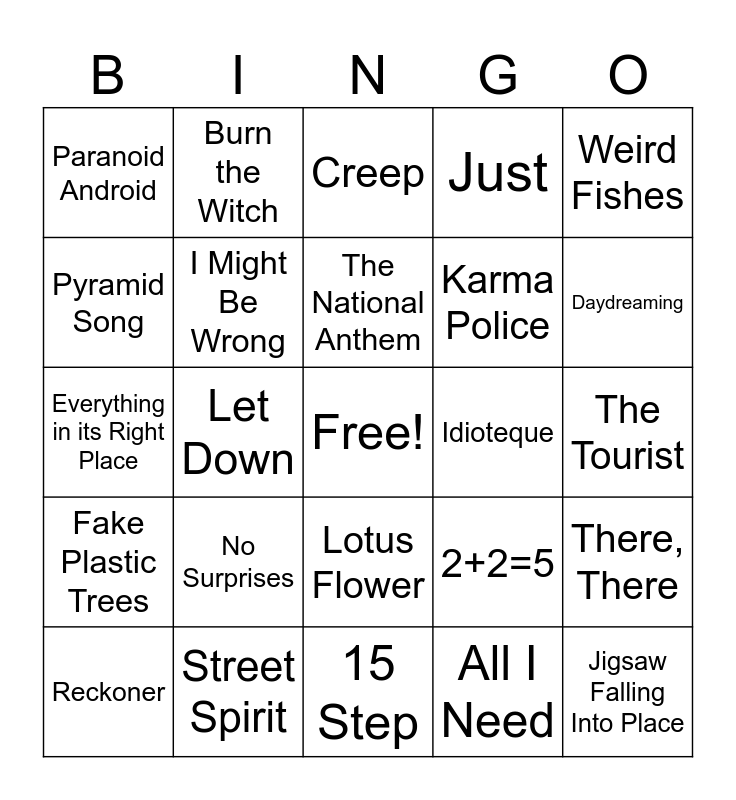 This bingo card has a free space and 24 words: No Surprises, Street Spirit, The National Anthem, Reckoner, Weird Fishes, Paranoid Android, Pyramid Song, Burn the Witch, Idioteque, Lotus Flower, Karma Police, Everything in its Right Place, 2+2=5, There, There, I Might Be Wrong, All I Need, The Tourist, Creep, Daydreaming, Let Down, Jigsaw Falling Into Place, Fake Plastic Trees, Just and 15 Step.