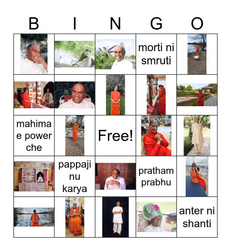 This bingo card has 19 images, a free space and 5 words: pappaji nu karya, mahima e power che, pratham prabhu, anter ni shanti and morti ni smruti.