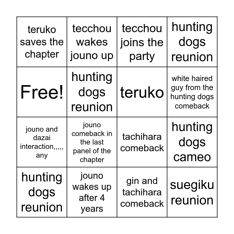 This bingo card has 16 words: jouno wakes up after 4 years, hunting dogs cameo, tecchou joins the party, teruko saves the chapter, jouno and dazai interaction,,,,, any, tecchou wakes jouno up, tachihara comeback, gin and tachihara comeback, Free!, hunting dogs reunion, hunting dogs reunion, hunting dogs reunion, jouno comeback in the last panel of the chapter, white haired guy from the hunting dogs comeback, teruko and suegiku reunion.