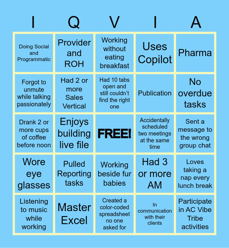This bingo card has a free space and 24 words: Pulled Reporting tasks, Master Excel, Had 10 tabs open and still couldn’t find the right one, Listening to music while working, Pharma, Doing Social and Programmatic, Forgot to unmute while talking passionately, Provider and ROH, Accidentally scheduled two meetings at the same time, Working beside fur babies, Publication, Drank 2 or more cups of coffee before noon, Had 3 or more AM, Loves taking a nap every lunch break, Had 2 or more Sales Vertical, In communication with their clients, Sent a message to the wrong group chat, Working without eating breakfast, No overdue tasks, Enjoys building live file, Participate in AC Vibe Tribe activities, Wore eye glasses, Uses Copilot and Created a color-coded spreadsheet no one asked for.