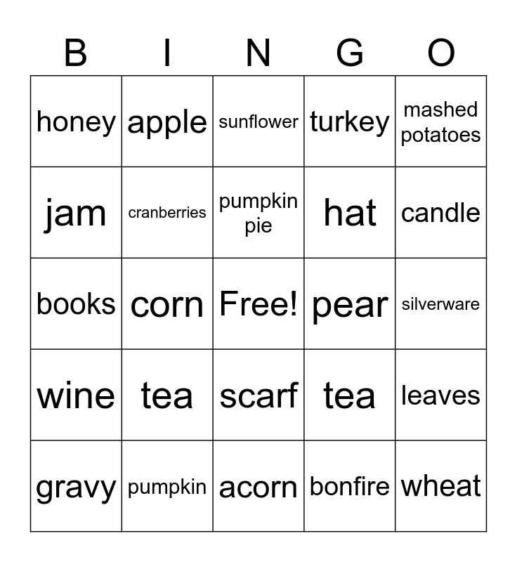 This bingo card has a free space and 24 words: tea, pumpkin, pumpkin pie, gravy, mashed potatoes, honey, jam, apple, pear, scarf, hat, books, tea, leaves, cranberries, bonfire, silverware, sunflower, candle, corn, wheat, wine, turkey and acorn.