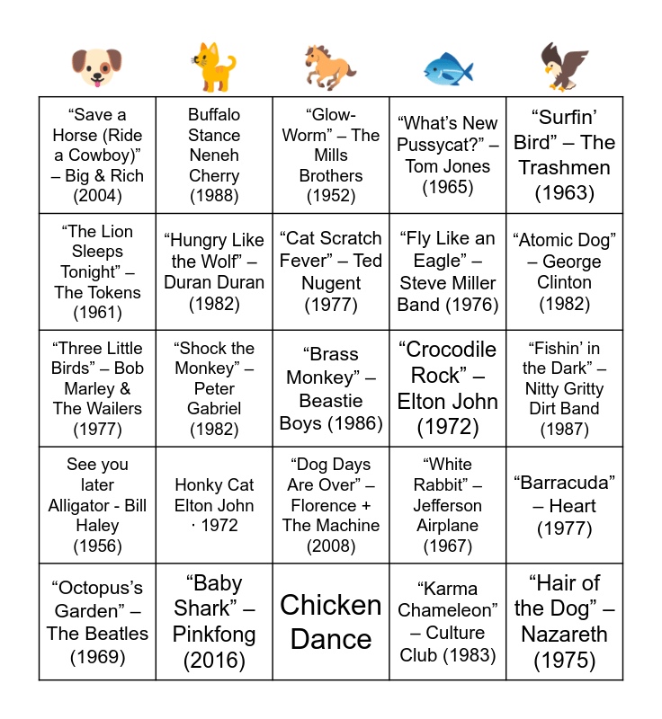 This bingo card has 35 words: “Who Let the Dogs Out” – Baha Men (2000), “Hound Dog” – Elvis Presley (1956), “Black Dog” – Led Zeppelin (1971), “Hungry Like the Wolf” – Duran Duran (1982), “Dog Days Are Over” – Florence + The Machine (2008), “What’s New Pussycat?” – Tom Jones (1965), “The Lion Sleeps Tonight” – The Tokens (1961), “Stray Cat Strut” – Stray Cats (1981), “Cat Scratch Fever” – Ted Nugent (1977), “Blackbird” – The Beatles (1968), “Three Little Birds” – Bob Marley & The Wailers (1977), “Surfin’ Bird” – The Trashmen (1963), “When Doves Cry” – Prince (1984), “Rockin’ Robin” – Bobby Day (1958), “Save a Horse (Ride a Cowboy)” – Big & Rich (2004), “Crocodile Rock” – Elton John (1972), “Karma Chameleon” – Culture Club (1983), “Shock the Monkey” – Peter Gabriel (1982), See you later Alligator - Bill Haley (1956), “Brass Monkey” – Beastie Boys (1986), “White Rabbit” – Jefferson Airplane (1967), “Octopus’s Garden” – The Beatles (1969), “Barracuda” – Heart (1977), “Baby Shark” – Pinkfong (2016), “Glow-Worm” – The Mills Brothers (1952), “Atomic Dog” – George Clinton (1982), “Hair of the Dog” – Nazareth (1975), “Cats in the Cradle” – Harry Chapin (1974), “Fly Like an Eagle” – Steve Miller Band (1976), “Fishin’ in the Dark” – Nitty Gritty Dirt Band (1987), “Ant Music” – Adam and the Ants (1980), Chicken Dance, Honky Cat Elton John ‧ 1972, Buffalo Stance Neneh Cherry (1988) and Puppy Love - Paul Anka (1959).