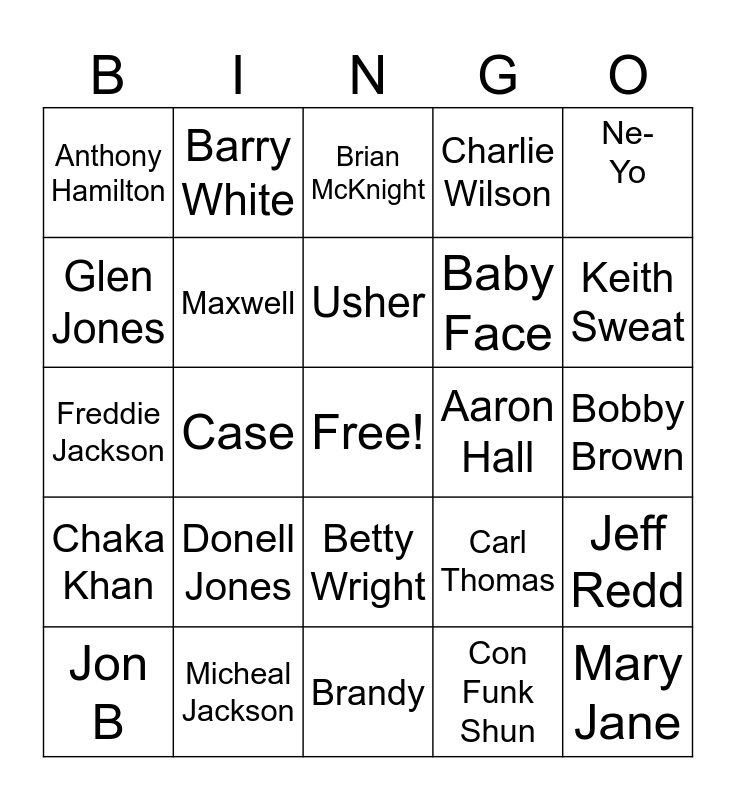 This bingo card has a free space and 24 words: Donell Jones, Micheal Jackson, Usher, Jon B, Ne-Yo, Anthony Hamilton, Glen Jones, Barry White, Aaron Hall, Betty Wright, Baby Face, Freddie Jackson, Carl Thomas, Jeff Redd, Maxwell, Con Funk Shun, Bobby Brown, Brian McKnight, Keith Sweat, Case, Mary Jane, Chaka Khan, Charlie Wilson and Brandy.