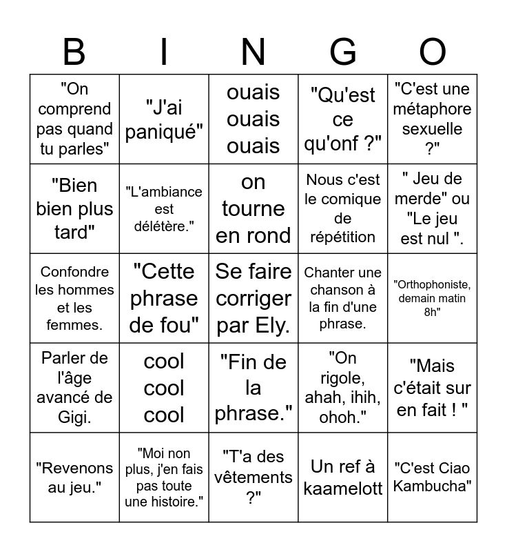 This bingo card has a free space and 24 words: cool cool cool, "Moi non plus, j'en fais pas toute une histoire.", on tourne en rond, "Revenons au jeu.", "C'est une métaphore sexuelle ?", "On comprend pas quand tu parles", "Bien bien plus tard", "J'ai paniqué", Chanter une chanson à la fin d'une phrase., "Fin de la phrase.", Nous c'est le comique de répétition, Confondre les hommes et les femmes., "On rigole, ahah, ihih, ohoh.", "Mais c'était sur en fait ! ", "L'ambiance est délétère.", Un ref à kaamelott, "Orthophoniste, demain matin 8h", ouais ouais ouais, " Jeu de merde" ou "Le jeu est nul "., "Cette phrase de fou", "C'est Ciao Kambucha", Parler de l'âge avancé de Gigi., "Qu'est ce qu'onf ?" and "T'a des vêtements ?".
