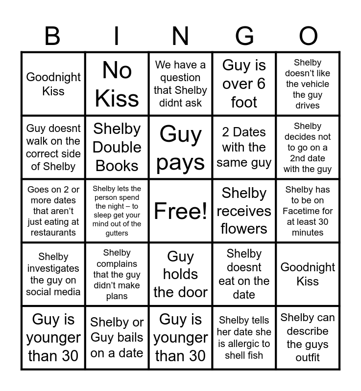 This bingo card has a free space and 24 words: Shelby complains that the guy didn’t make plans, Shelby or Guy bails on a date, Guy pays, Guy is younger than 30, Shelby doesn’t like the vehicle the guy drives, Goodnight Kiss, Guy doesnt walk on the correct side of Shelby, No Kiss, Shelby receives flowers, Guy holds the door, 2 Dates with the same guy, Goes on 2 or more dates that aren’t just eating at restaurants, Shelby doesnt eat on the date, Goodnight Kiss, Shelby Double Books, Shelby tells her date she is allergic to shell fish, Shelby has to be on Facetime for at least 30 minutes, We have a question that Shelby didnt ask, Shelby decides not to go on a 2nd date with the guy, Shelby lets the person spend the night – to sleep get your mind out of the gutters, Shelby can describe the guys outfit, Shelby investigates the guy on social media, Guy is over 6 foot and Guy is younger than 30.