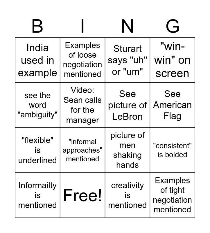 This bingo card has 28 words: Lebron mentions nationality, see Spain's Flag, "flexible" is underlined, Picture of Chris Croft, Video: Sean calls for the manager, Sturart says "uh" or "um", Examples of loose negotiation mentioned, Examples of tight negotiation mentioned, Free!, Picture of world, picture of men shaking hands, "win-win" on screen, "patient" is underlined, Lebron mentions cultural norms, "informal approaches" mentioned, See Brazil's flag, Lebron mentions emotional intelligence, See picture of LeBron, See American Flag, "tight" culture is mentioned, India used in example, Japan used in example, Informailty is mentioned, "consistent" is bolded, creativity is mentioned, Retail shops are mentioned, see the word "ambiguity" and see the word "adherence".