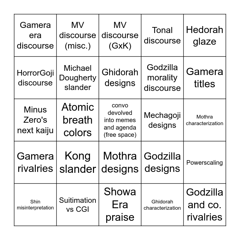 This bingo card has a free space and 24 words: Kong slander, Suitimation vs CGI, Ghidorah designs, Shin misinterpretation, Hedorah glaze, Gamera era discourse, HorrorGoji discourse, MV discourse (misc.), Mechagoji designs, Mothra designs, Godzilla morality discourse, Minus Zero's next kaiju, Godzilla designs, Powerscaling, Michael Dougherty slander, Ghidorah characterization, Mothra characterization, MV discourse (GxK), Gamera titles, Atomic breath colors, Godzilla and co. rivalries, Gamera rivalries, Tonal discourse and Showa Era praise.