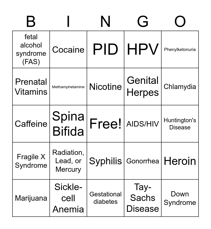 This bingo card has a free space and 24 words: Radiation, Lead, or Mercury, Sickle-cell Anemia, Nicotine, Marijuana, Phenylketonuria, fetal alcohol syndrome (FAS), Prenatal Vitamins, Cocaine, AIDS/HIV, Syphilis, Genital Herpes, Caffeine, Gonorrhea, Heroin, Methamphetamine, Tay-Sachs Disease, Huntington's Disease, PID, Chlamydia, Spina Bifida, Down Syndrome, Fragile X Syndrome, HPV and Gestational diabetes.