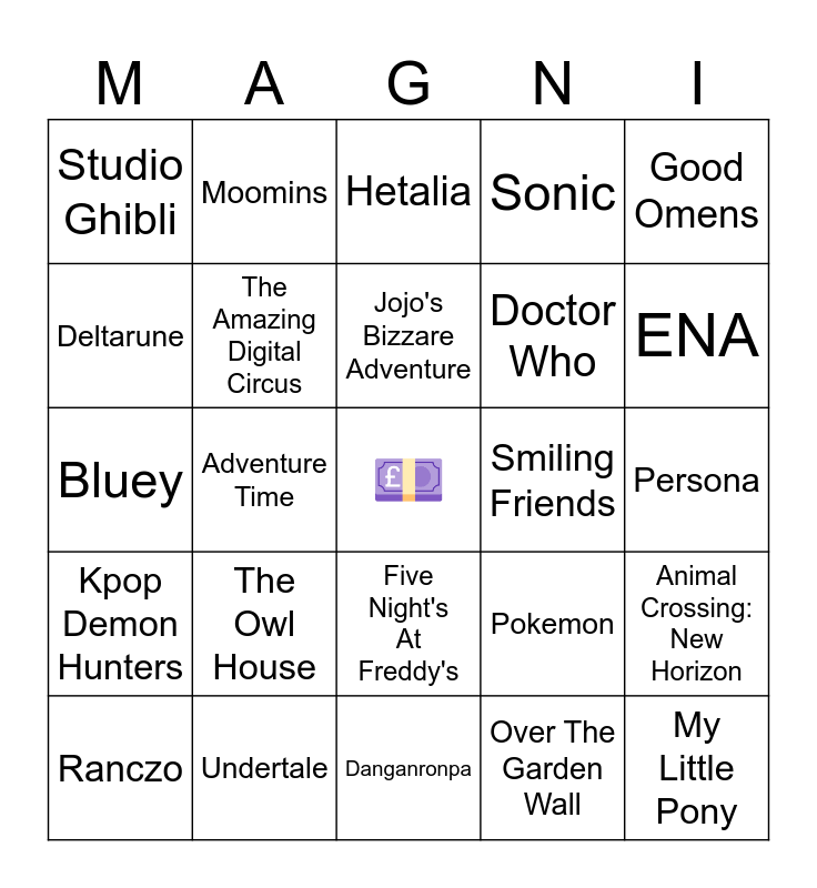 This bingo card has a free space and 24 words: The Owl House, Undertale, Jojo's Bizzare Adventure, Ranczo, Good Omens, Studio Ghibli, Deltarune, Moomins, Smiling Friends, Five Night's At Freddy's, Doctor Who, Bluey, Pokemon, Animal Crossing: New Horizon, The Amazing Digital Circus, Over The Garden Wall, Persona, Hetalia, ENA, Adventure Time, My Little Pony, Kpop Demon Hunters, Sonic and Danganronpa.