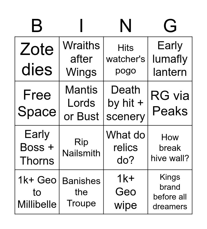 This bingo card has 16 words: Banishes the Troupe, How break hive wall?, Hits watcher's pogo, Zote dies, Early Boss + Thorns, Wraiths after Wings, What do relics do?, 1k+ Geo wipe, Free Space, Mantis Lords or Bust, 1k+ Geo to Millibelle, Early lumafly lantern, Rip Nailsmith, RG via Peaks, Death by hit + scenery and Kings brand before all dreamers.