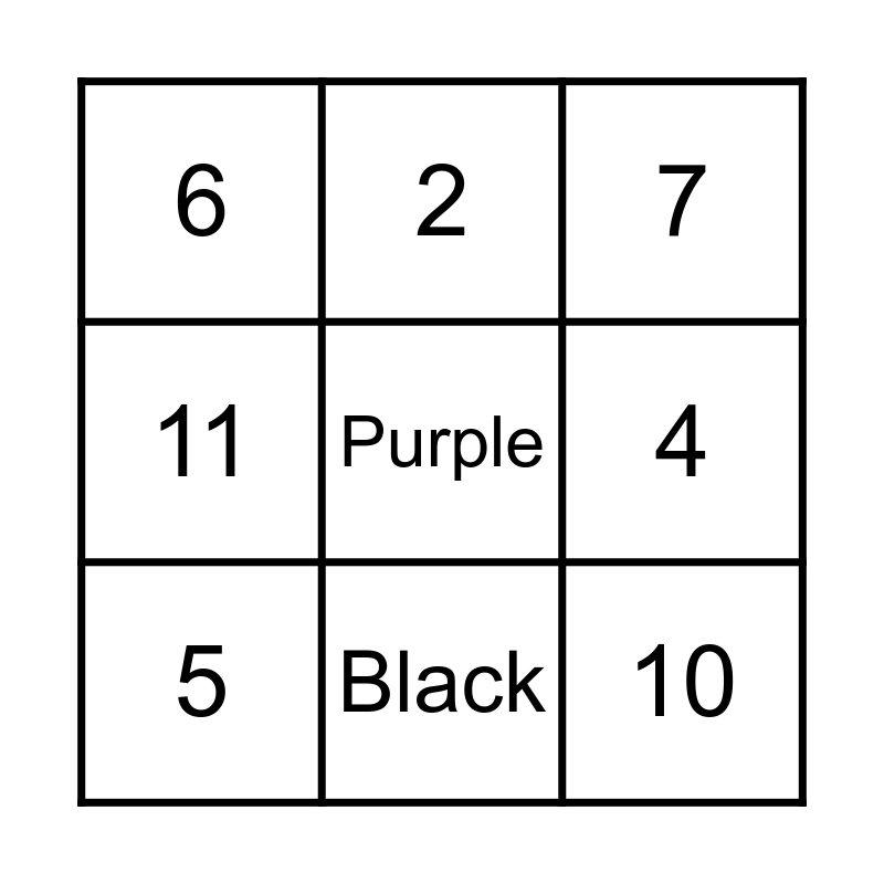 This bingo card has 22 words: Free!, 1, 2, 3, 4, 5, 6, 7, 8, 9, 10, 11, 12, Red, Orange, Yellow, Green, Blue, Pink, Purple, Black and White.