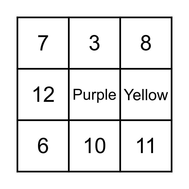 This bingo card has 21 words: 1, 2, 3, 4, 5, 6, 7, 8, 9, 10, 11, 12, Red, Orange, Yellow, Green, Blue, Pink, Purple, Black and White.