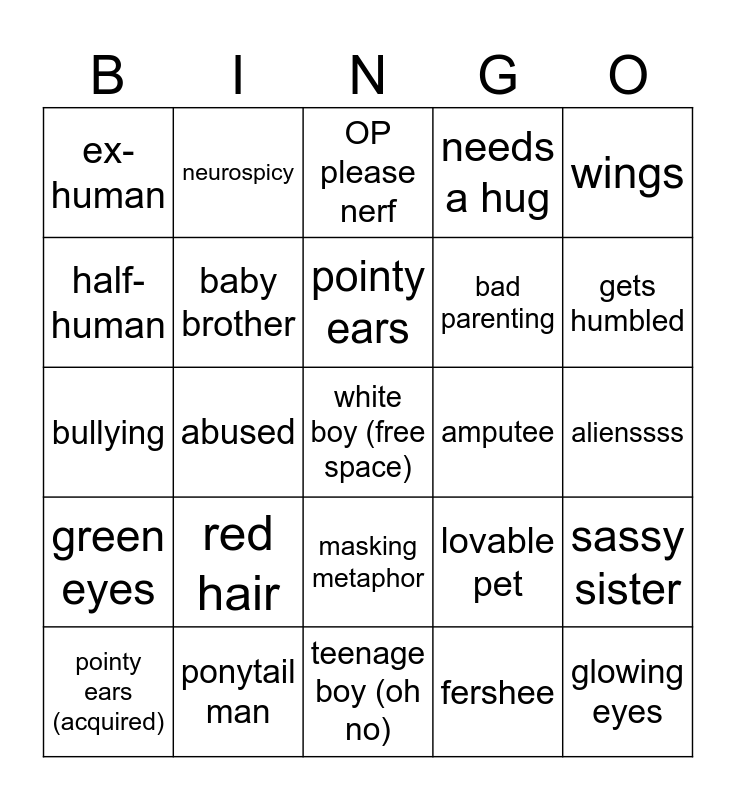 This bingo card has a free space and 24 words: red hair, ponytail man, pointy ears, pointy ears (acquired), wings, ex-human, half-human, neurospicy, amputee, masking metaphor, bad parenting, bullying, lovable pet, sassy sister, baby brother, fershee, alienssss, OP please nerf, gets humbled, abused, glowing eyes, green eyes, needs a hug and teenage boy (oh no).