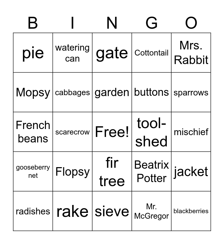 This bingo card has a free space and 24 words: Flopsy, rake, garden, radishes, Mrs. Rabbit, pie, Mopsy, watering can, tool-shed, fir tree, buttons, French beans, Beatrix Potter, jacket, cabbages, Mr. McGregor, mischief, gate, sparrows, scarecrow, blackberries, gooseberry net, Cottontail and sieve.