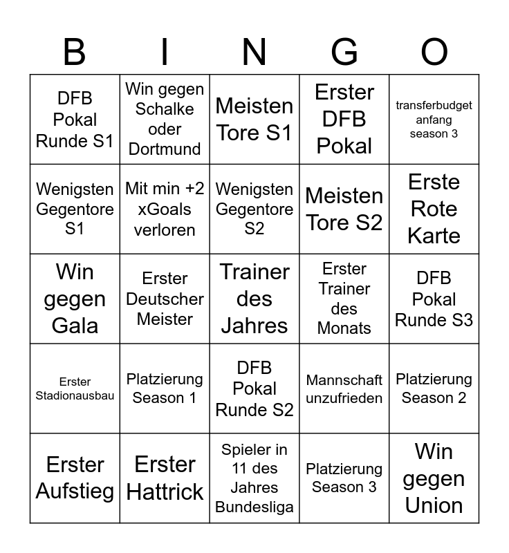 This bingo card has a free space and 24 words: Platzierung Season 1, Erster Hattrick, Wenigsten Gegentore S2, Erster Aufstieg, transferbudget anfang season 3, DFB Pokal Runde S1, Wenigsten Gegentore S1, Win gegen Schalke oder Dortmund, Erster Trainer des Monats, DFB Pokal Runde S2, Meisten Tore S2, Win gegen Gala, Mannschaft unzufrieden, Platzierung Season 2, Mit min +2 xGoals verloren, Platzierung Season 3, DFB Pokal Runde S3, Meisten Tore S1, Erste Rote Karte, Erster Deutscher Meister, Win gegen Union, Erster Stadionausbau, Erster DFB Pokal and Spieler in 11 des Jahres Bundesliga.
