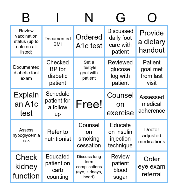 This bingo card has a free space and 25 words: Refer to nutritionist, Discuss long term complications (eye, kidneys, heart), Set a lifestyle goal with patient, Check kidney function, Provide a dietary handout, Review vaccination status (up to date on all listed), Documented diabetic foot exam, Documented BMI, Counsel on exercise, Counsel on smoking cessation, Reviewed glucose log with patient, Explain an A1c test, Educate on insulin injection technique, Doctor adjusted medications, Checked BP for diabetic patient, Checked BP, Assessed medical adherence, Ordered A1c test, Patient goal met from last visit, Schedule patient for a follow up, Order eye exam referral, Educated patient on carb counting, Assess hypoglycemia risk, Discussed daily foot care with patient and Review patient blood sugar.