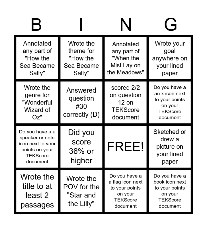 This bingo card has 16 words: Wrote the title to at least 2 passages, Wrote the POV for the "Star and the Lilly", Annotated any part of "When the Mist Lay on the Meadows", Wrote your goal anywhere on your lined paper, Wrote the genre for "Wonderful Wizard of Oz", Wrote the theme for "How the Sea Became Salty", FREE!, Sketched or drew a picture on your lined paper, Annotated any part of "How the Sea Became Salty", Answered question #30 correctly (D), Do you have a a flag icon next to your points on your TEKScore document, Do you have a an x icon next to your points on your TEKScore document, Do you have a a speaker or note icon next to your points on your TEKScore document, Did you score 36% or higher, scored 2/2 on question 12 on TEKScore document and Do you have a book icon next to your points on your TEKScore document.