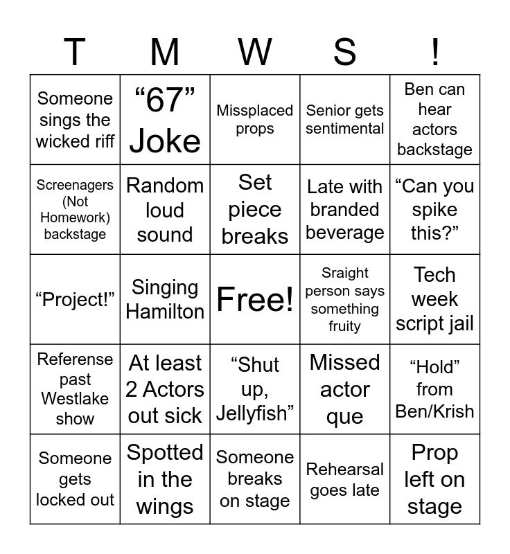 This bingo card has a free space and 27 words: Missed actor que, Skipped line, Late with branded beverage, Someone breaks on stage, Screenagers (Not Homework) backstage, Missplaced props, “67” Joke, Referense past Westlake show, Sraight person says something fruity, “Hold” from Ben/Krish, “Project!”, Senior gets sentimental, Someone gets locked out, Spotted in the wings, “Can you spike this?”, “Where’s my ensemble?” -Ben, Random loud sound, Set piece breaks, At least 2 Actors out sick, Someone sings the wicked riff, Tech week script jail, Rehearsal goes late, Singing Hamilton, Prop left on stage, “Shut up, Jellyfish”, Ben can hear actors backstage and Missed (tech) que.