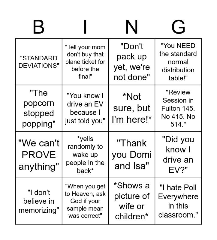 This bingo card has 16 words: "When you get to Heaven, ask God if your sample mean was correct", "Did you know I drive an EV?", "Don't pack up yet, we're not done", "STANDARD DEVIATIONS", "We can't PROVE anything", "Tell your mom don't buy that plane ticket for before the final", "Thank you Domi and Isa", *Shows a picture of wife or children*, "The popcorn stopped popping", "You know I drive an EV because I just told you", "I don't believe in memorizing", "You NEED the standard normal distribution table!", *yells randomly to wake up people in the back*, "Review Session in Fulton 145. No 415. No 514.", *Not sure, but I'm here!* and "I hate Poll Everywhere in this classroom.".