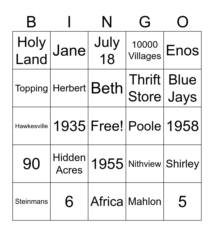 This bingo card has a free space and 32 words: Mahlon, Elizabeth, 1935, Nov. 25, 90, Herbert, Enos, Shirley, Jane, Ann, Beth, July 18, 1959, 66, Poole, Wanner, Steinmans, Hawkesville, 1955, Hidden Acres, Nithview, Conference Minister, 1958, 6, 5, 10000 Villages, Thrift Store, Topping, Holy Land, Africa, New Hamburg and Blue Jays.