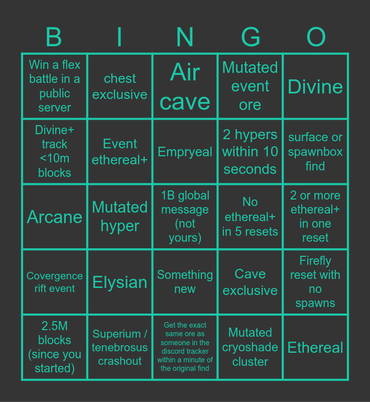 This bingo card has 32 words: Mutated cryoshade cluster, 1B+, Mutated hyper, Legendary mega chest, Covergence rift event, Event ethereal+, Divine, Firefly reset with no spawns, chest exclusive, Ethereal, Empryeal, Air cave, Layer stone🔥🔥🔥🔥, Mutated Ethereal, No ethereal+ in 5 resets, Mutated exotic, 2.5M blocks (since you started), Arcane, Something new, Elysian, Cave exclusive, Out of layer, 2 or more ethereal+ in one reset, Superium / tenebrosus crashout, 1B global message (not yours), Mutated event ore, 2 hypers within 10 seconds, Divine+ track <10m blocks, Win a flex battle in a public server, Get the exact same ore as someone in the discord tracker within a minute of the original find, Get a spawn message right as uvb-76 buzzes and surface or spawnbox find.